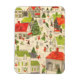 Retro design with red and lime green. Christmas village with decorated Christmas trees, decorated houses, people walking about and cars in driveways. Cute