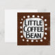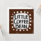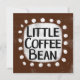 A cute typographic message design that says "Little Coffee Bean". It has black text on a white rectangle with funky, playful white dots surrounding it, all on a brown background.