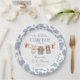 The centre design showcases a watercolor clothesline adorned with sweet baby cowboy items — denim overalls, boots, hat, and a bandanna — surrounded by a stylish blue and white cowhide border. Personalised text such as the honoree’s name and event date can be added for a unique, custom touch.