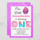 Girly and sweet Little Cupcake purple glitter first birthday invitation with doughnut and candy letters. Easily add your full name, and the date, time and address of the birthday party. Perfect for a sweet little princess turning one!