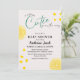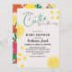 This a little cutie is on the way citrus lemon theme baby shower invitation features lemon with flowers and leaves in pink,orange and yellow.