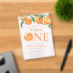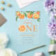 Celebrate your little cutie's 1st birthday with these adorable fruit-themed birthday invitations! The invites feature a top border of watercolor oranges, complete with vibrant green leaves and orange blossoms. The phrase "Our little cutie is turning one" is displayed in cheerful orange lettering, accompanied by a watercolor orange slice, all set against a frosted or transparent acrylic background. Personalise the orange 1st birthday party invites with your child's name and party details. These summer-themed invitations are perfect for both girls and boys, bringing a fresh and fruity touch to the celebration!