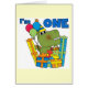 Little Dino 1st Birthday T-shirts, bodysuits, cards, stickers, birthday buttons, tote bags, keepsakes, and other dinosaur 1st birthday apparel and gifts featuring a green smiling dinosaur with balloons, party hat, and a gift!