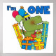 Little Dino 1st Birthday T-shirts, bodysuits, cards, stickers, birthday buttons, tote bags, keepsakes, and other dinosaur 1st birthday apparel and gifts featuring a green smiling dinosaur with balloons, party hat, and a gift!