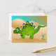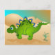 Cute cartoon little dinosaur lost and wondering in the desert.