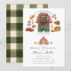 Celebrate your little farmer on the way with this charming farm-themed baby shower invitation. Featuring a sweet baby outfit with green overalls and red plaid shirt surrounded by adorable farm elements like a barn, tractor, baby bottle, straw hat, vegetables, and baby animals, this rustic design is perfect for a farmhouse, country, or barnyard baby shower. The soft watercolor illustrations and classic gingham background create a warm, cosy countryside feel. Easily personalise with your event details for a unique and memorable baby shower invitation your guests will love.
