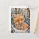 Cute drawing of a small fox sitting in a snowy forest, surrounded by snow-covered trees and a serene atmosphere.