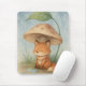 A whimsical watercolor illustration of a small fox taking shelter under a giant mushroom during a gentle rain. With soft, earthy tones and a dreamy atmosphere, this piece captures the quiet magic of a rainy day in the forest.