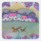 Watercolour and ink painting of two little red foxes wandering past some quirky cottages