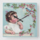 Small child intently gazes at Bluebird chirping on a flowering tree branch. Vintage design is pretty in soft aqua blue and pink colours.