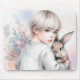 A charming little girl with short blonde hair gazes tenderly while cradling a fluffy bunny, captured beautifully in a watercolor painting
