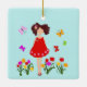 Little girl wearing a red dress. She is walking in the garden among beautiful flowers and colourful butterflies.