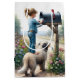 A young girl balances on a large dog's back to reach an open mailbox along a country road lined with vibrant flowers.