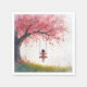 A young girl in a pink dress sits on a swing hanging from a cherry blossom tree.