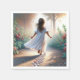 A young girl in a white dress is running down a path lined with pink heart-shaped petals, surrounded by vibrant flowers and greenery