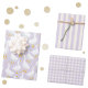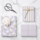 Fun soft pastel lilac purple Little Goose themed gift wrap featuring a hand-painted goose pattern with matching awning stripes and lilac gingham checks. The sweet gouache geese art and coordinating patterns are perfect for both boys and girls.