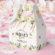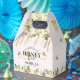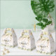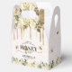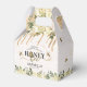 Cute bee hive birthday favour boxes featuring a honeycomb background, faux gold foil drips, white watercolor florals, bees, and a elegant thank you template that is easy to personalise.