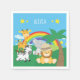 Add a cute colourful jungle theme to the birthday party or baby shower of your little boy or girl with this adorable custom safari paper napkin. Napkin has a zebra, giraffe, elephant, and lion, all near a palm tree, a rainbow, and bright sunny stars. The name of your little kid completes the look.