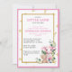 Adorable flat baby shower invite for a "sweet little lamb." Features a baby lamb with pink highlights on the bottom standing next to a teddy bear - and there's greenery behind them, a gold frame around the text box, and gold stars and cherries with a pink border setting off the entire design. Each line of text is easily updated.