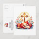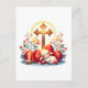 A peaceful scene featuring a fluffy white lamb resting among vibrant red eggs adorned with golden crosses. A glowing Byzantine-style cross rises behind them, framed by blooming spring flowers and a softly lit candle. The composition blends warm symbolism, tradition, and charm in a gentle, pastel-toned palette.