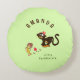 Round pillow with funny little monkey and running banana on light green background