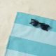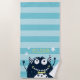 Adorable personalized beach towel for kids features a cute smiling monster illustration sporting a dapper lime green bow tie, on a tone on tone turquoise stripe background. Personalize with a name in lime green.