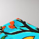 An illustration of a little orange and tan bird perched on a branch, with coral orange flower buds, against a soft turquoise background
