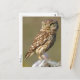 Animal card showing a little owl. The little owl (Athene noctua) is a bird that inhabits much of the temperate and warmer parts of Europe, Asia east to Korea, and north Africa. The adult little owl of the most widespread form is white-speckled brown above, and brown-streaked white below. It has a large head, long legs, and yellow eyes, and its white “eyebrows” give it a stern expression. This species has a bounding flight like a woodpecker.