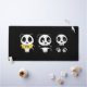 Two little pandas sitting in the dark with a tiny skeleton. One Panda is wearing a yellow tee shirt with the word "meh" on it.