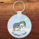 A little penguin cartoon bending to get a snow ball avoiding another one. Custom text on both sides.