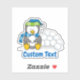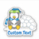 A little penguin cartoon sitting and holding a snowball. Custom text.