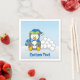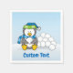 A little penguin cartoon sitting and holding a snowball. Custom text.