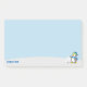 A little penguin cartoon waving in front of a snowball stack. Custom text.