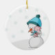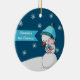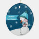 Adorable first Christmas ornament with an illustration of a snowman and a pig hugging each other. One one side the background is dark blue and you can personalise the text with your own. On the other side, the background is white and there is not text. Illustrated and designed by Patricia Alvarez.