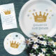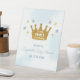 A little prince is on the way! Boy baby shower with gold crown and silver and gold stars with dreamy blue watercolor background
