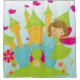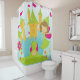 A cute and colourful shower curtain for the little princess features a royal castle, princess with brown hair and magic wand, a frog prince, and pretty flowers on a blue gradient background!