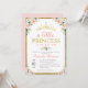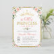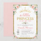 This invite is suitable for the mother-to-be expecting a girl and features a gold tiara with faux glitter text and blush pink flowers.