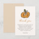 This flat card Thank You note features a darling hand-drawn pumpkin tied with a bow. The typography is playful and modern. Original artwork and design by Annie Montgomery Design.
