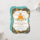 Aqua, gold, and brown fall oak leaves background print with gold glitter border and aqua blue gingham check trim with bunting banner swag and little pumpkin baby boy autumn baby shower invitation card design.