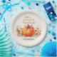 Celebrate your fall baby shower with these adorable “A Little Pumpkin Is on the Way” paper plates. Featuring a sweet watercolor pumpkin topped with a pink bow and surrounded by warm autumn florals, these personalised plates add a festive seasonal touch to your table setting. Perfect for a baby girl shower, they coordinate beautifully with the full Little Pumpkin party collection for a cosy, charming celebration.
