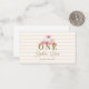 A cute, sweet and stylish personalised note card for a girl baby 1st birthday party, with a pink pumpkin theme, perfect for Halloween or the fall, the harvest etc. It features a watercolor painting of a pink pumpkin with a pink bow, and pink roses, as well as a few fall leaves.