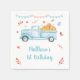 This elegant design features cute fall leaves and a blue truck filled with hay and pumpkins.