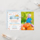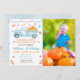 This invitation features cute fall leaves and a blue truck filled with hay and pumpkins.
