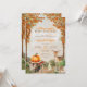 The invitation features a picturesque forest setting adorned with vibrant fall leaves in shades of orange, red, and gold, creating a warm and inviting backdrop. Nestled among the trees, you'll find an array of adorable woodland creatures—playful squirrels gathering acorns, curious hedgehogs exploring the underbrush, a gentle rabbit nibbling on leaves, and a graceful deer peeking through the foliage. Scattered among these charming animals are whimsical mushrooms, adding a touch of enchantment to the scene.
