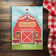 Original illustrated red barn with sheep, pigs, chicks, horses and mama hen. Bright blue sky with clouds; photo on the back is optional.