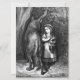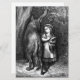This design features an illustration from the classic children's fairy tale "Little Red Riding Hood". The two best known versions of the fairy tale were written by Charles Perrault and the Brothers Grimm. This classic illustration was drawn by the famous French artist Gustave Doré (1832–1883), who illustrated many books for both adults and children. In this scene, Alice and the wolf are facing in opposite directions, but she is staring directly in the wolf's eyes, unafraid of the wild animal. She is a courageous and confident girl. Alice is wearing a traditional long dress. The wolf's long tail and long legs can be seen clearly, and the creature's ears are pricked up.