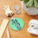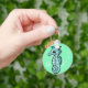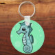 A keychain featuring an adorable digital illustration of a cute little blue cartoon seahorse on a sea green bubble covered background.