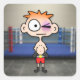 Cute cartoon boxer with orange hair and red shorts standing outside the ring with a big purple shiner. This little guy is a champion in the making!