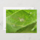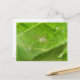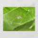 This postcard features a detailed photograph of a little garden spider sitting on a broccoli leaf. The tiny creature is almost transparent. The photograph is so detailed you can even see a couple of strands of the spiders web.