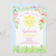 This sweet sunshine birthday party invitation features a pretty watercolor sun, florals and grass, a blue sky background, and soft pink text. Perfect for a sunny party any time of the year, and the start to a wonderful sunshine party! A pretty floral patterned back-side is included.